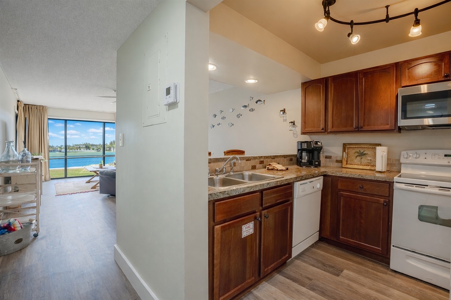 The Salty Soul condo just enjoyed a complete makeover and now sparkles with all new flooring, appliances, furniture, kitchen wares, paint, updated bathrooms, and more. You'll relax in a spacious living area equipped with seating including a new sleeper sofa while you take in the incredible view of the resort's iconic 8th hole island green. Step out the sliding doors to the covered patio and bring your coffee for a peaceful start to each day. A smart TV adorns the wall and the lightning fast WIFI offer inside entertainment and keep you connected.